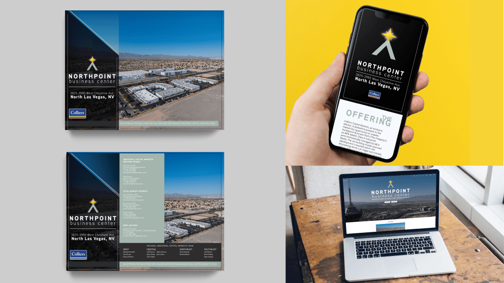 Northpoint Business Park | This collection shows samples of a branding guide, including color palette, logo design, and parts of the 33 page offering memorandum for a 127,132 SF six building development within the blossoming North Las Vegas submarket.